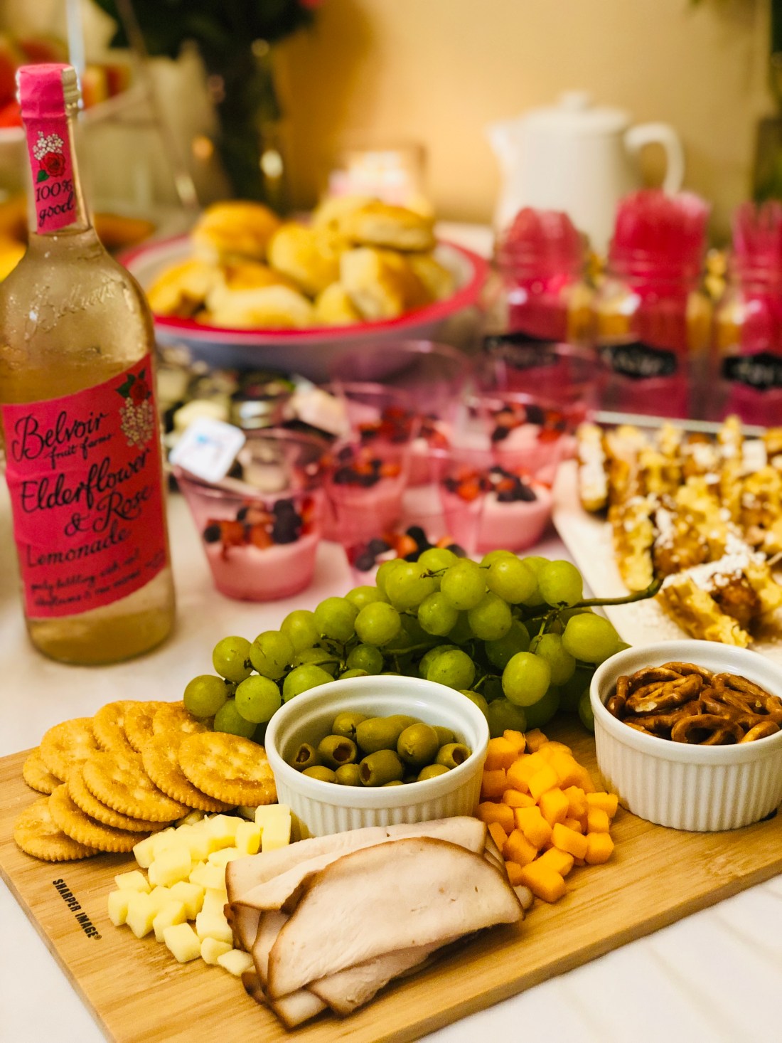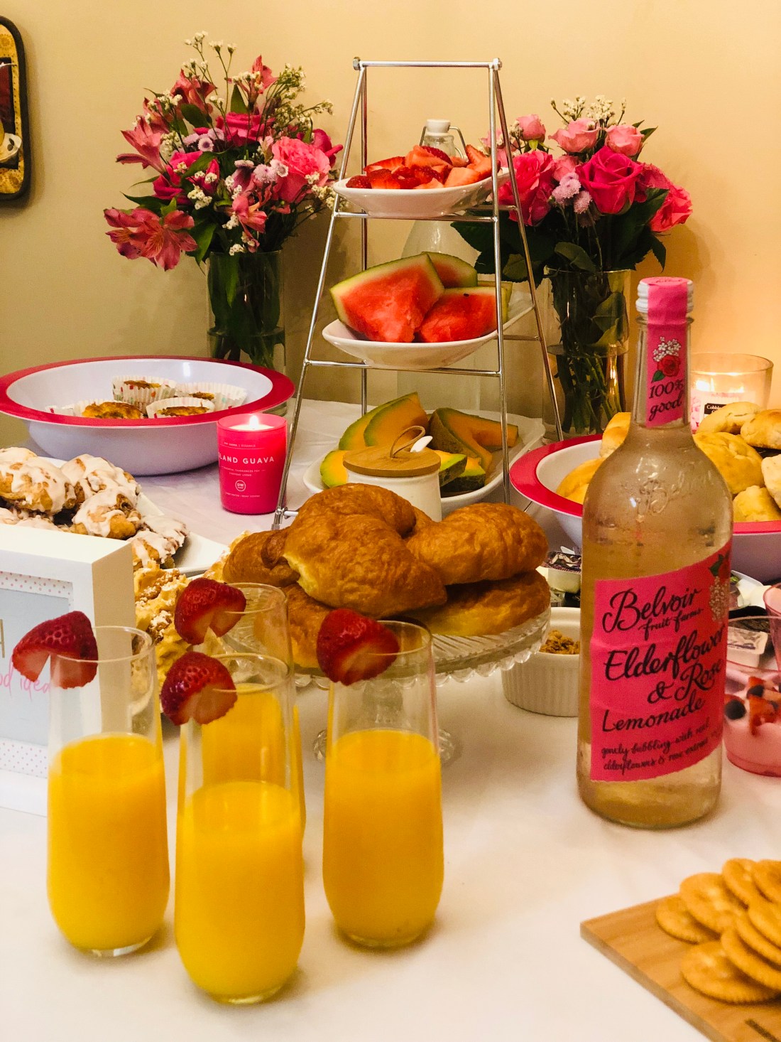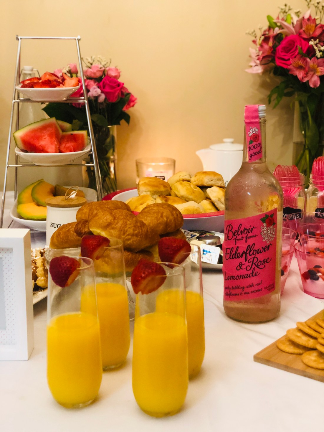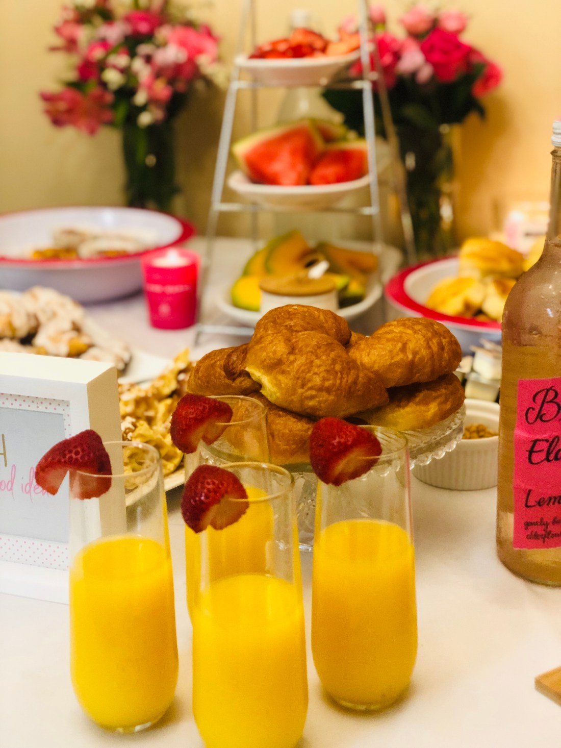 Mimosa Bar/Drink Bar: Sparkling white grape juice, orange juice and we also had Elderflower and rose lemonade and water…