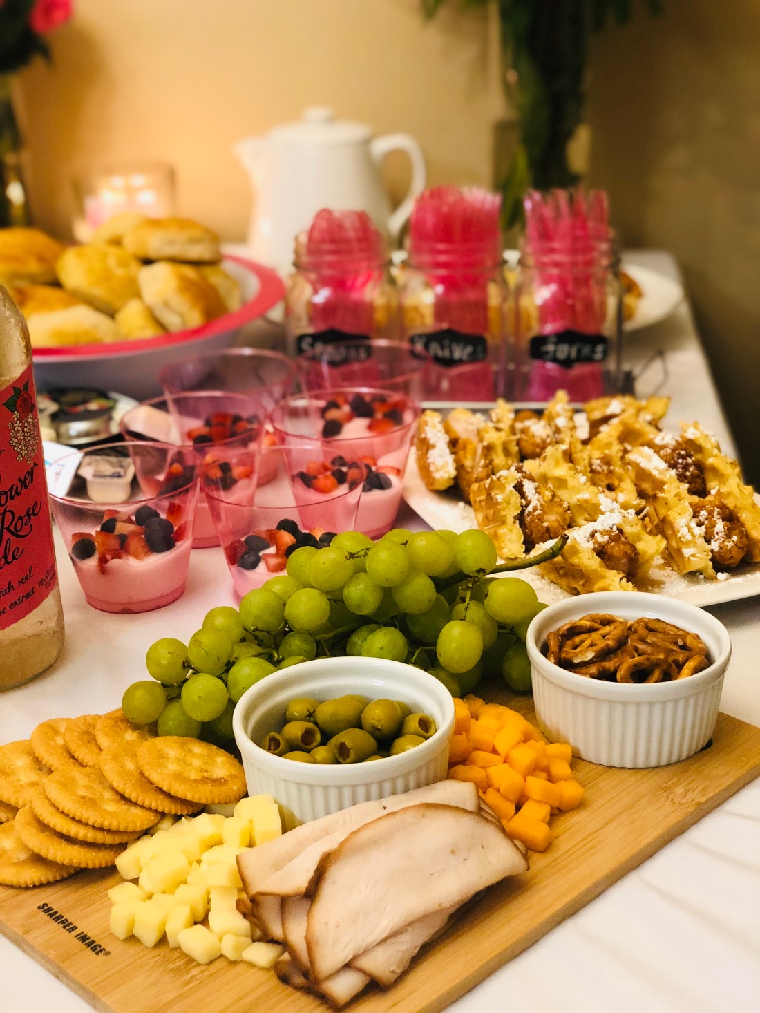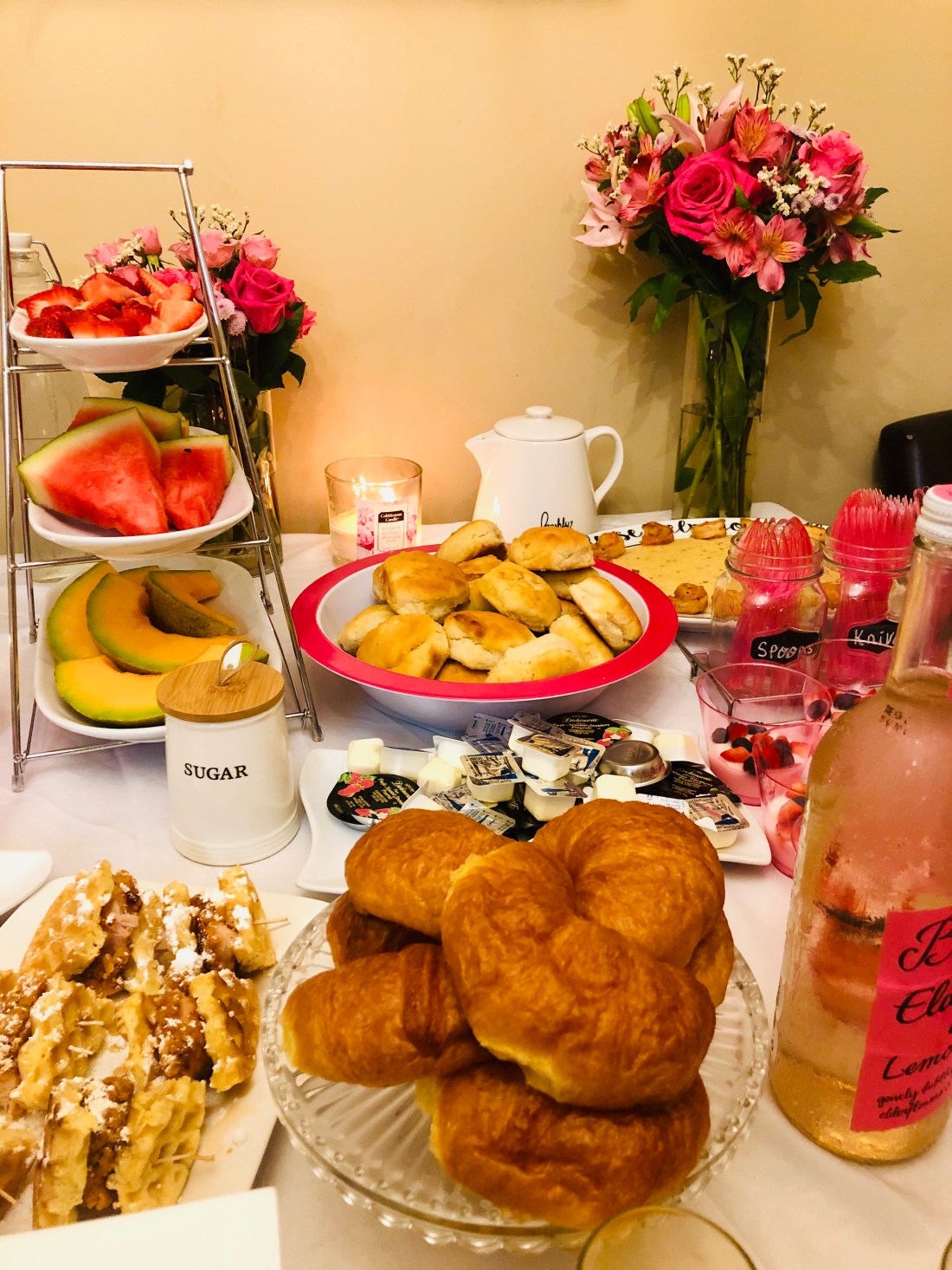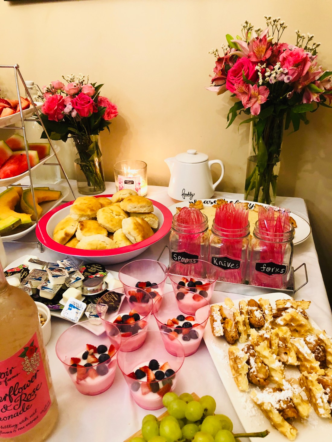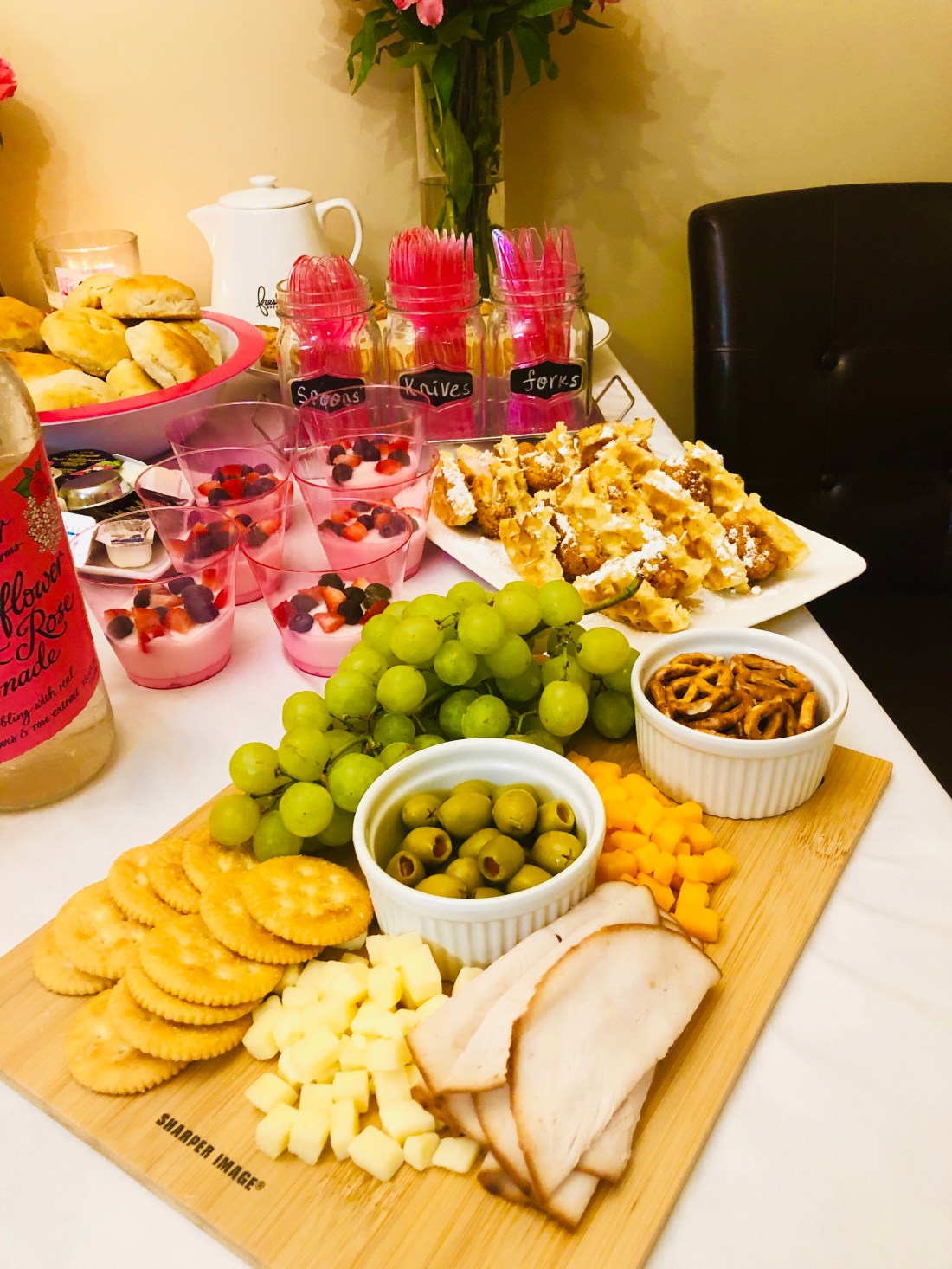 Mimosa Bar/Drink Bar: Sparkling white grape juice, orange juice and we also had Elderflower and rose lemonade and water…